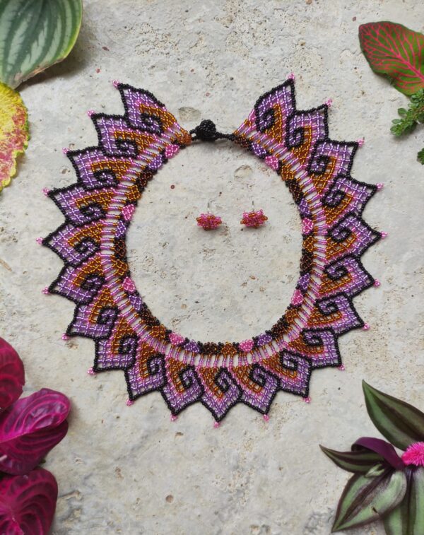 Collar okama con topos en mostacilla checa tejido a mano por artesanos kamentsa del Valle del Sibundoy.